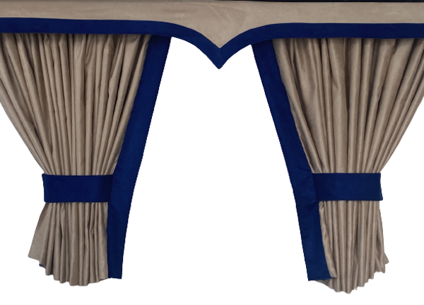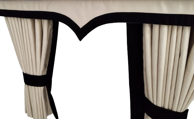 Sivuverhot: Raskas ja pimentävä kaksinkertainen Alcantara-kangas. Sisäreunoissa leveä tehostekanttaus.