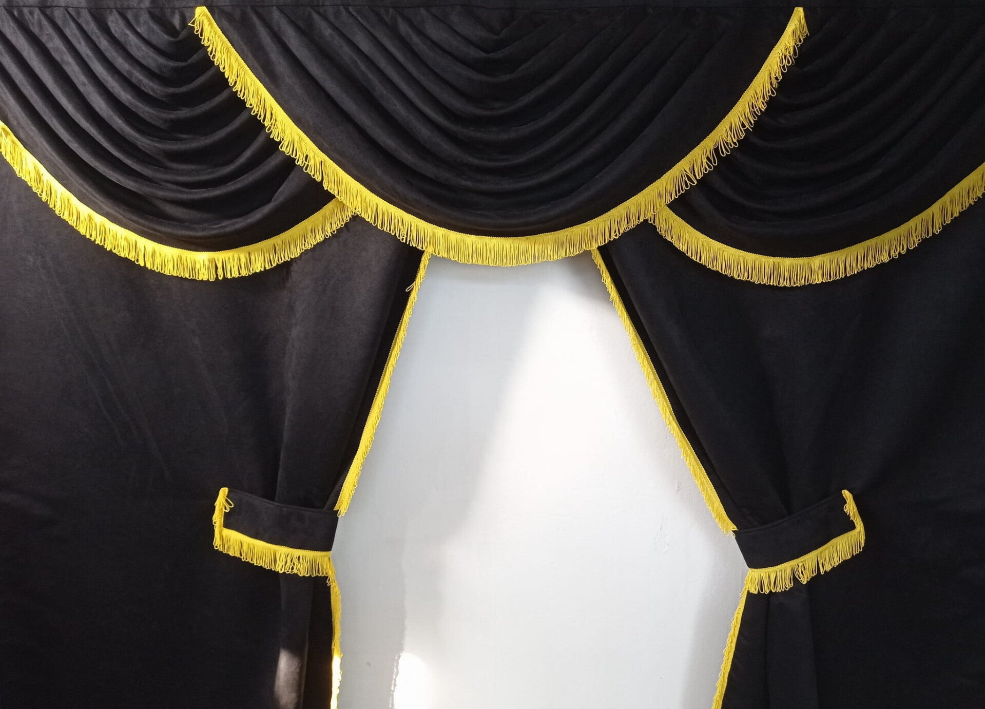 Kaksi laajaa makuutilan verhoa: Raskaasti ja siististi laskeutuva materiaali.